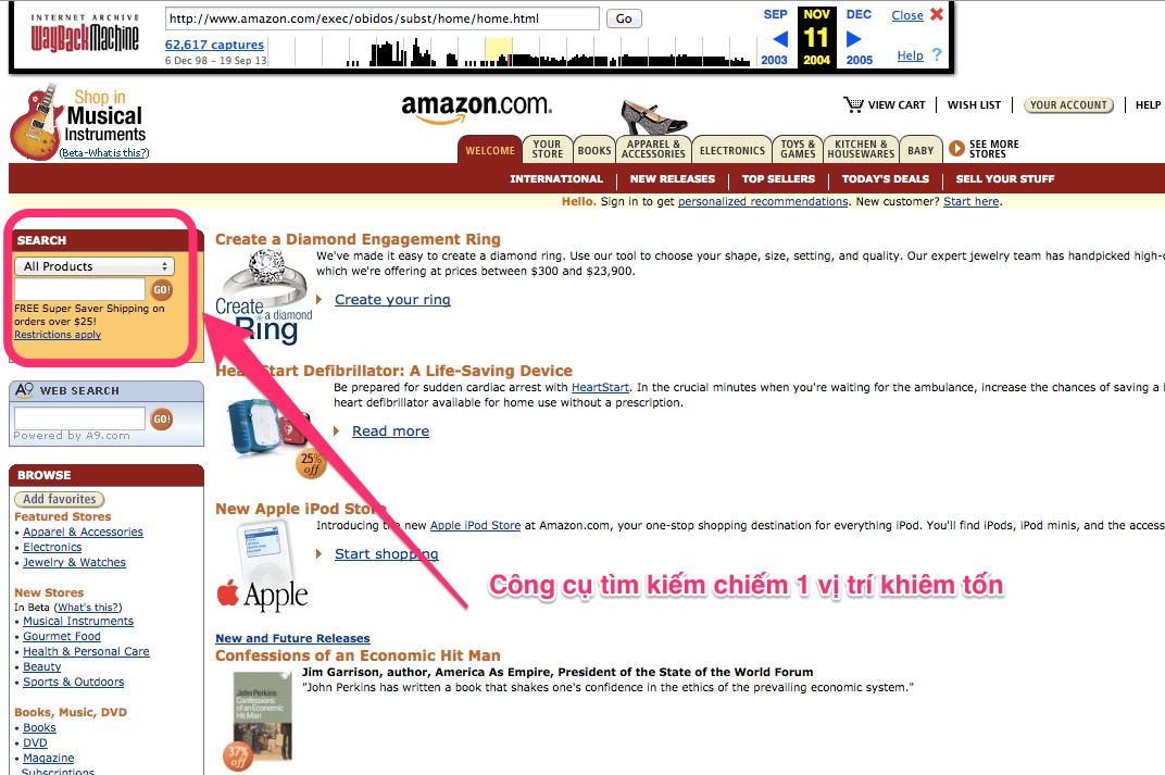 Cách đây 10 năm, tính năng tìm kiếm chỉ chiếm 1 vị trí khiêm tốn trên trang chủ của Amazon.com.Điều này bạn phải đặc biệt lưu tâm vì trong một thế giới cạnh tranh như ngày nay, nếu khách hàng không tìm được sản phẩm mà họ cần từ bạn thì rất có thể họ sẽ tìm thấy sản phẩm đó trên website của đối thủ cạnh tranh. Tôi có cần phải mô tả bi kịch tiếp theo mà bạn sẽ phải hứng chịu là gì không? Chắc chắn là bạn không muốn nghe đâu!