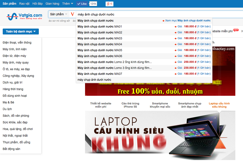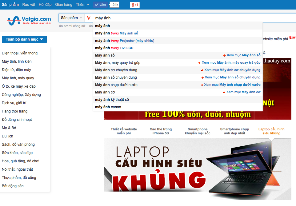 Ngoài việc giới hạn kết quả tìm kiếm, bạn còn có thể làm thế nào để tăng tính tiện ích cho người dùng khi tìm kiếm sản phẩm? Theo tôi, bạn nên đưa ra những gợi ý khi người dùng gõ từ khóa vào công cụ tìm kiếm. Việc gợi ý này sẽ giúp khách hàng nhanh chóng định hình được sản phẩm mà mình mong muốn tìm kiếm.Ví dụ sau đây là cách mà Vatgia.com đưa ra gợi ý với từ khóa mà tôi đang tìm kiếm: “máy ảnh”.