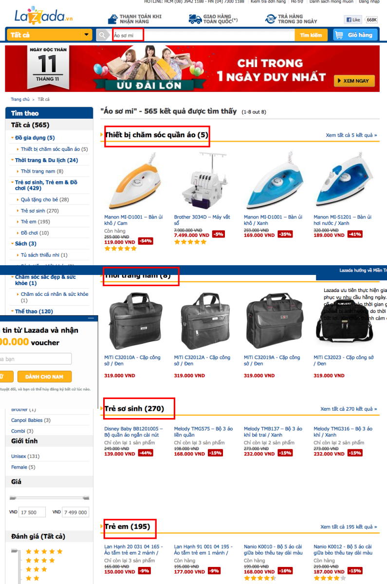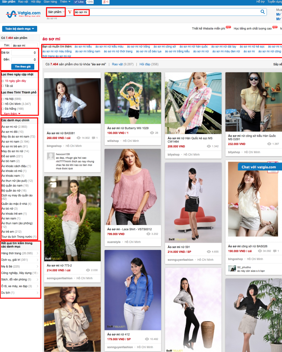 Như trong hình mô tả nêu trên, tôi đang tiến hành tìm kiếm từ khóa “Áo sơ mi” tại Vatgia.com. Vatgia.com đã cung cấp cho tôi nhiều bộ lọc giúp tôi có thể giới hạn hoặc thu hẹp lại kết quả tìm kiếm mong muốn như: từ khóa chi tiết hơn (“áo sơ mi công sở”), lọc theo giới tính (“áo sơ mi nam”), theo vị trí địa lý (“Hà Nội”, “Đà Nẵng”), theo danh mục (“áo trẻ em”, “may đo áo sơ mi”), theo khoảng giá, v.v...
