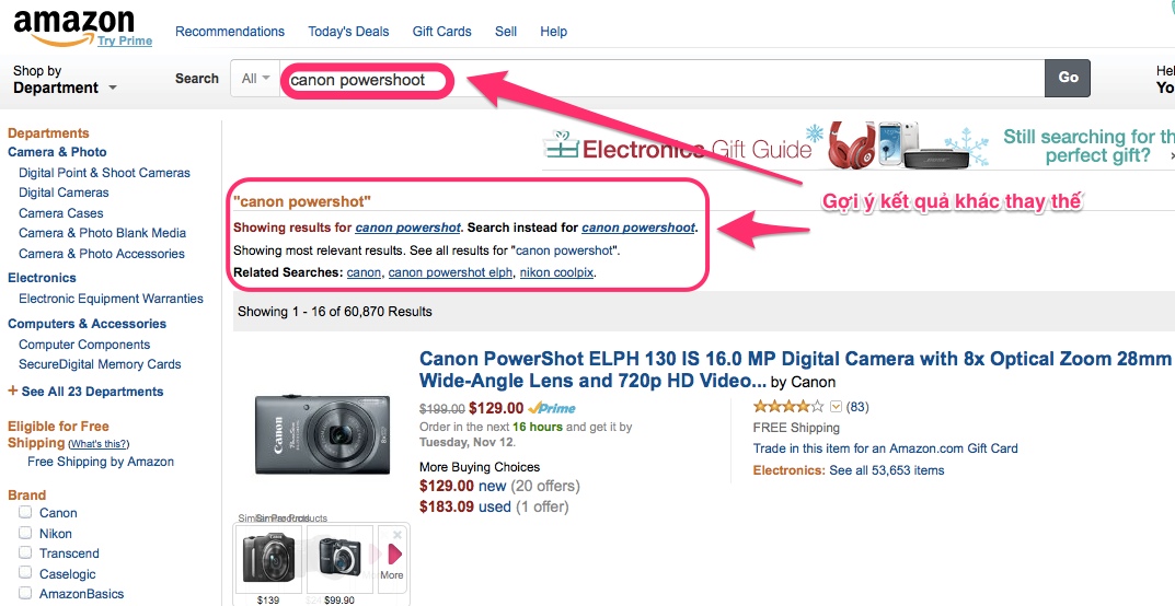 Như trong ví dụ minh họa trên, tôi đang muốn tìm mua 1 máy chụp hình của Canon với thương hiệu “PowerShot” tại Amazon.com. Tuy nhiên, do không nhớ chính xác hoặc hiểu lầm nên tôi đã gõ thành “Powershoot”. Amazon không từ chối kết quả của tôi mà đưa ra cho tôi vài gợi ý thay thế nhằm đính chính lại từ khóa tìm kiếm.
